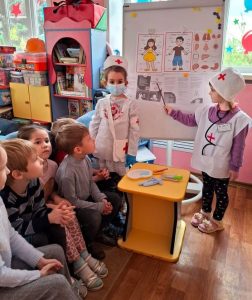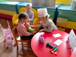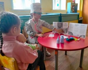 С дошкольниками среднего возраста были проведены беседы «Я прививок не боюсь», «Откуда берутся болезни», а со старшими воспитанниками беседовали о том, зачем делают прививки и как прививки помогают бороться с болезнями. Ребята с удовольствием обыгрывали разные ситуации в ходе сюжетно-ролевых игр «Больница», «Поликлиника», «Аптека», просмотрели мультипликационные фильмы «Про бегемота, который боялся прививок», «Лунтик и его друзья» (серия «Прививка»).